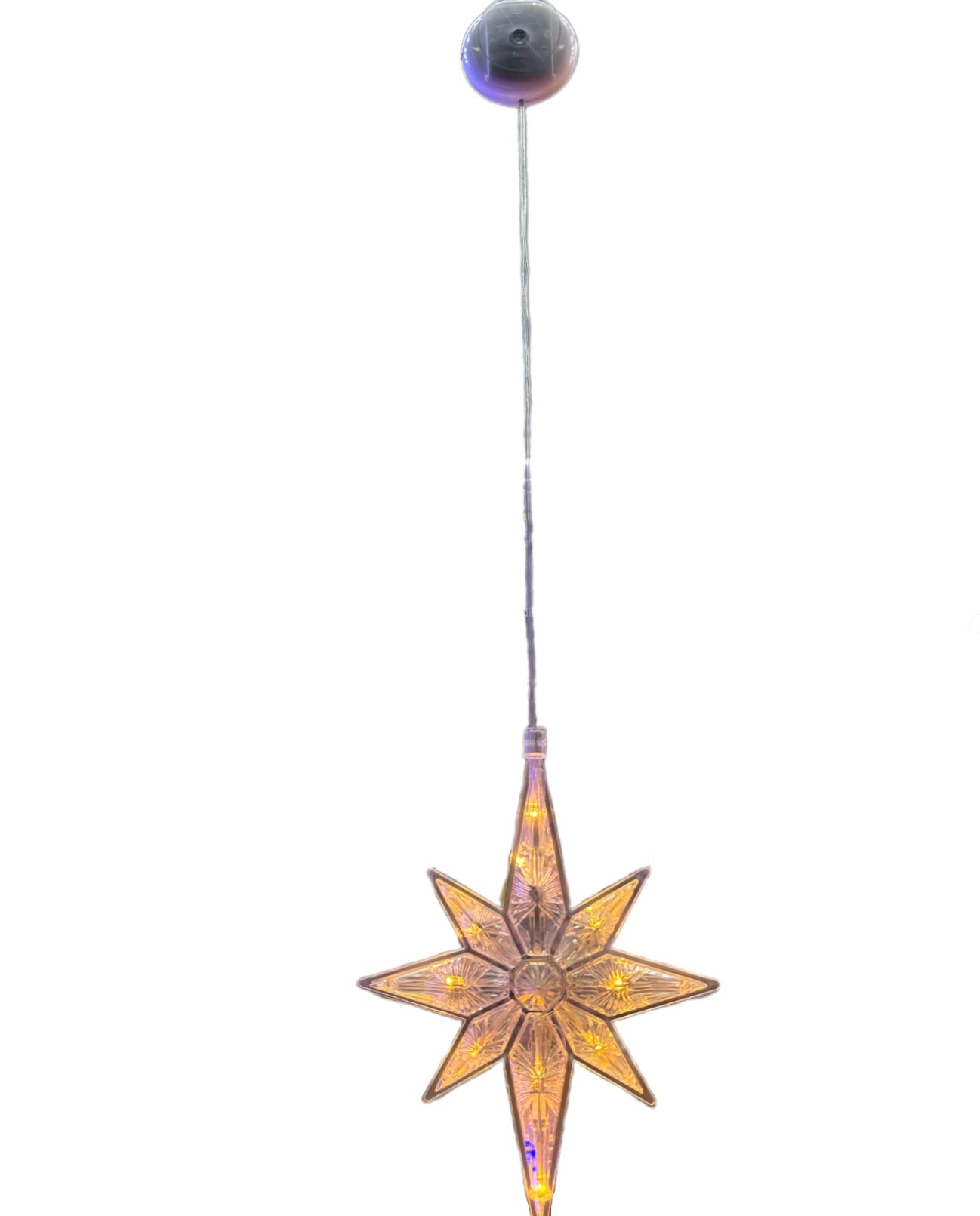 Yıldız şeklindeki dekoratif LED ışık, sıcak sarı tonlu aydınlatmasıyla ortama şık bir hava katar. Ürünün üst kısmında bulunan sağlam vantuz aparatı, cam, fayans veya düz yüzeylere kolayca yapıştırılmasını sağlar. Elektrik bağlantısı gerektirmeden pratik kullanım sunar. Yılbaşı süslemeleri, vitrin dekorları veya ev içi ambiyans ışıkları için idealdir.